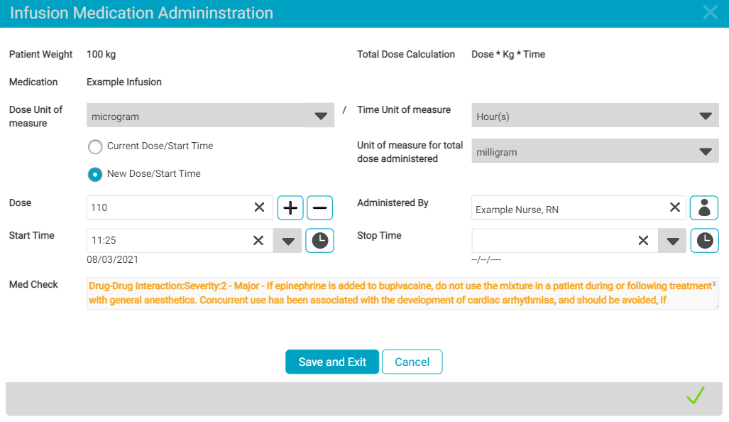 - Edit the Dose field and/or Start Time as necessary. Dose Unit of measure, Time Unit of measure, and Unit of measure for total dose administered may not be edited after an infusion is started.
