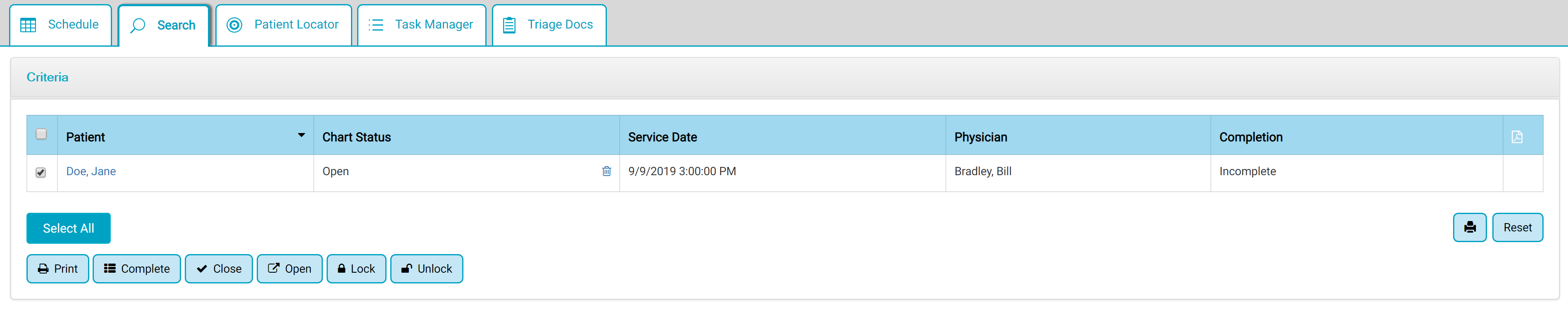 Use the Save Data Delete (Trash Can) in the Search tab to remove the chart. The Save Data Delete marks a chart as complete, closes it, and creates a PDF copy of the chart that is stored at the patient level in Document Central in HST Practice Management. Ensure that all necessary documentation is correct and complete (including documenting patient discharge in the Discharge Status BLOC) prior to this process, as the chart cannot be edited after the Save Data Delete is performed.