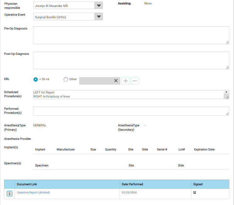 • If the Operative Report is signed, ensure the Signed checkbox is selected - this will complete the Operative Report BLOC so the physician does not have to open the chart and sign it again. If the Operative Report is unsigned, the triaging user can deselect the box and the physician will be able to sign the report in HST eChart by signing the BLOC.
