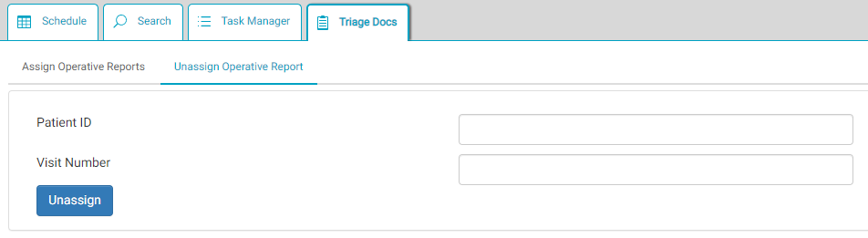 • Enter the Patient ID and Visit Number for the operative reports to be unassigned.