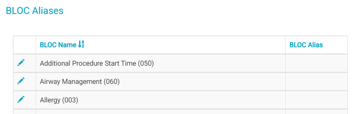 BLOCs can be given an alias. The alias, instead of the BLOC name, will display in charts when the BLOC is added on the fly. It will also be the name for the BLOC when adding it to a Chart Template, though a Title Override may still be assigned. BLOC Aliases can be configured in HST eChart in Admin Home by navigating to the BLOC Alias tile. On the BLOC Aliases page, each BLOC’s number will appear in parentheses after the BLOC name.