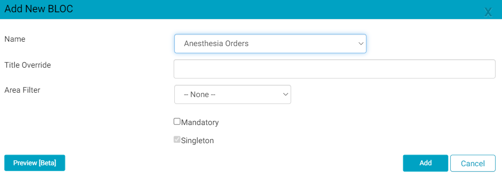 - Tap the Add BLOC button to open the following flyout. Selected the BLOC to add from the drop-down. If desired, enter a Title Override for the BLOC. A Title Override is the name the BLOC will have in the chart. If available and applicable, check whether the BLOC should be mandatory and/or a singleton. If the BLOC being added is the Anesthesia or Physician Orders BLOC an additional field will appear - Area Filter. If an Area Filter is selected, then the BLOC will only display the orders for the selected area – when the BLOC is being added to the Physician or Anesthesia workflow. By default, orders BLOCs only display the orders for the clinical area in which the BLOC is residing (Pre-Op, Intra-Op, etc.).