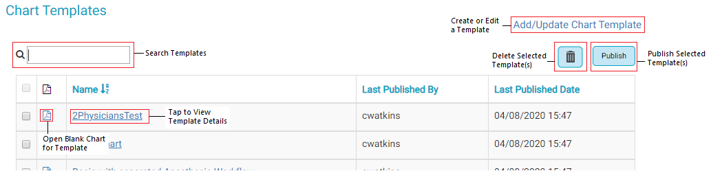 - Tap the PDF icon to the left of the Chart Template Name. Note: If the template has not yet been published there will not be a PDF icon. Select the template and tap the Publish button to create a PDF of the blank chart template.
