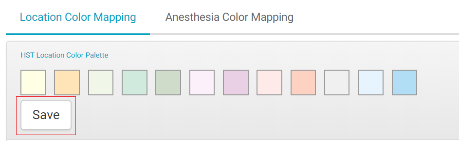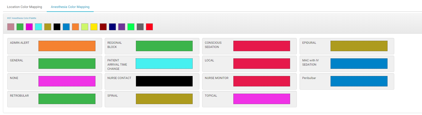 Color Mapping is used to set the colors for the patient locator and anesthesia types. Anesthesia type color appears as a thin strip of color down the right side of the patient’s scheduled appointment on the HST eChart schedule. Location color mapping is used in HST eChart on the schedule, in the Clinical Patient Locator, and in the Public Patient Locator. Color Mapping can be accessed in Admin Home in the Configuration section.